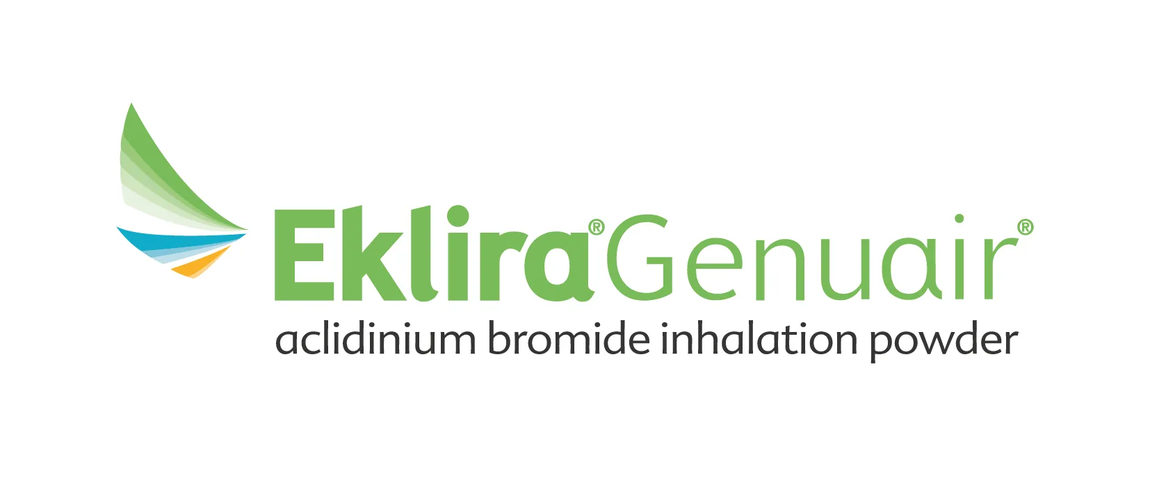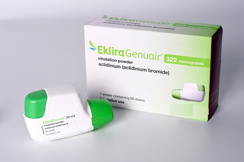Eklira Genuair inhalation powder in a white inhaler with an integral dose indicator and a green dosage button. Each delivered dose contains 375 μg aclidinium bromide equivalent to 322 μg of aclidinium indicated for maintenance bronchodilator treatment to relieve symptoms in adult patients with chronic obstructive pulmonary disease (COPD).
