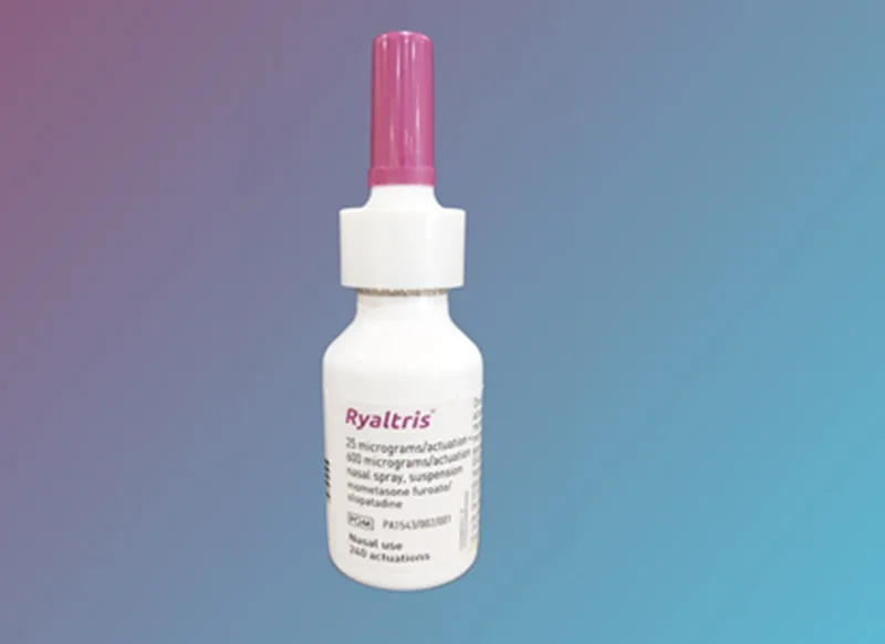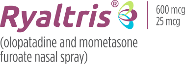 Presentation: One delivered dose contains mometasone furoate monohydrate equivalent to 25 mcg mometasone furoate and olopatadine hydrochloride equivalent to 600 mcg olopatadine. White, homogeneous suspension.Use: In adults and adolescents 12 years of age and older for the treatment of moderate to severe nasal symptoms associated with allergic rhinitis.Dosage: For nasal use only. Adults and adolescents (12 years of age and over) two actuations in each nostril twice daily (morning and evening). Elderly: no dose adjustment required. Children under 12 years: not recommended. Renal and hepatic impairment: no dose adjustment expected.Contraindications: Hypersensitivity to the active substance or to any of the excipients. Presence of untreated localised infection involving the nasal mucosa, such as herpes simplex. Recent nasal surgery or trauma until wound healing has occurred.Warnings and Precautions: Instances of nasal ulceration and nasal septal perforation have been reported. Not recommended in case of nasal septum perforation. Patients using Ryaltris over several months or longer should be examined periodically for possible changes in the nasal mucosa and for evidence of Candida infection. Instances of epistaxis have been reported. Visual disturbance may be reported with systemic and topical corticosteroid use. Consider referral to ophthalmologist with symptoms such as blurred vision or other visual disturbances as cataract, glaucoma or rare diseases such as central serous chorioretinopathy have been reported after use of systemic and topical corticosteroids. Hypersensitivity reactions, including wheezing, may occur – discontinue. Immunosuppression: use with caution, if at all, in patients with active or quiescent tuberculous infections of the respiratory tract, untreated local or systemic fungal or bacterial infections, systemic viral or parasitic infections, or ocular herpes simplex. Potential systemic effects of corticosteroids include Cushing’s syndrome, Cushingoid features, adrenal suppression, growth retardation in children and adolescents, cataract, glaucoma and more rarely, a range of psychological or behavioural effects including psychomotor hyperactivity, sleep disorders, anxiety, depression or aggression (particularly in children). Hypercorticism and adrenal suppression may appear at higher-than-recommended dosages or in susceptible individuals at recommended dosages – discontinue slowly. Increased risk of signs or symptoms of hypercorticism and/or suppression of the HPA axis possible with concomitant use with other inhaled corticosteroids. Careful monitoring needed for acute adrenal insufficiency in response to stress in patients previously treated for prolonged periods with systemic corticosteroids and transferred to topical corticosteroids. In patients with asthma or other conditions requiring long-term systemic corticosteroid treatment, too rapid a decrease in systemic corticosteroids may cause a severe exacerbation of symptoms. Somnolence has been reported following administration of Ryaltris in clinical studies. Caution in patients operating machinery or driving a motor vehicle. Avoid concurrent use with alcohol or other central nervous system (CNS) depressants. Increased risk of antihistamine adverse effects with concomitant use of olopatadine or other antihistaminic drugs administered via nasal, ocular or oral route. Paediatric population: It is recommended that the height of children receiving prolonged treatment with nasal corticosteroids is regularly monitored. Contains 0.02 mg benzalkonium chloride in each actuation. Benzalkonium chloride may cause irritation or swelling inside the nose, especially if used for a long time.Interactions: No interaction studies have been performed with Ryaltris. Any interactions from the combination of olopatadine and mometasone furoate are expected to reflect those of the components taken individually, no pharmacokinetic interaction between olopatadine and mometasone furoate was observed when administered in combination.